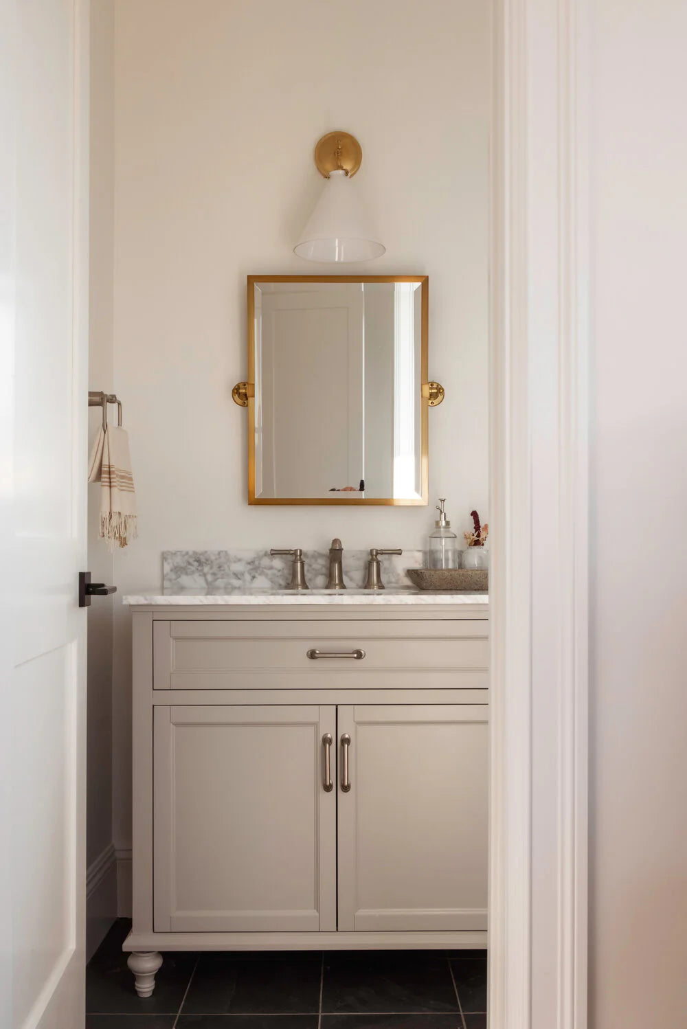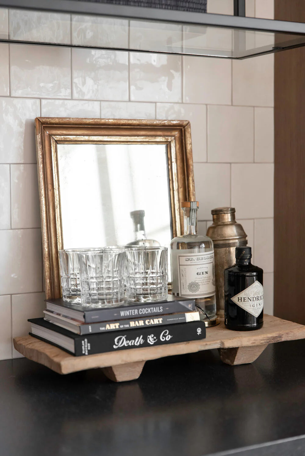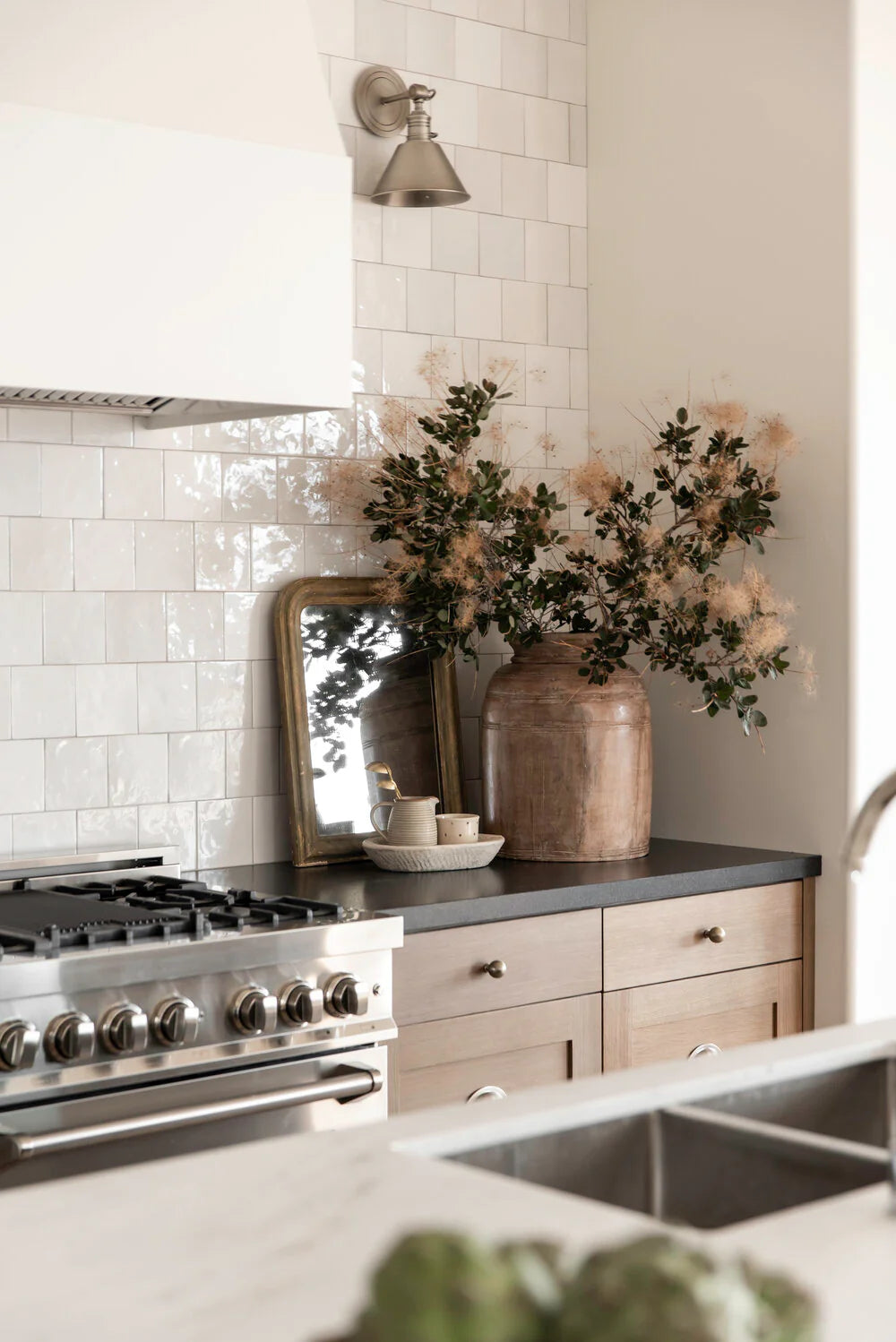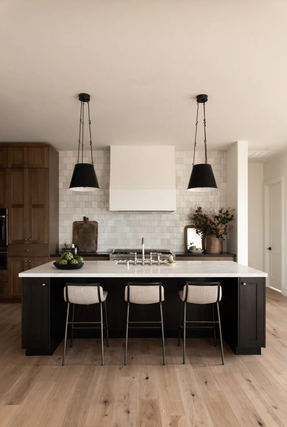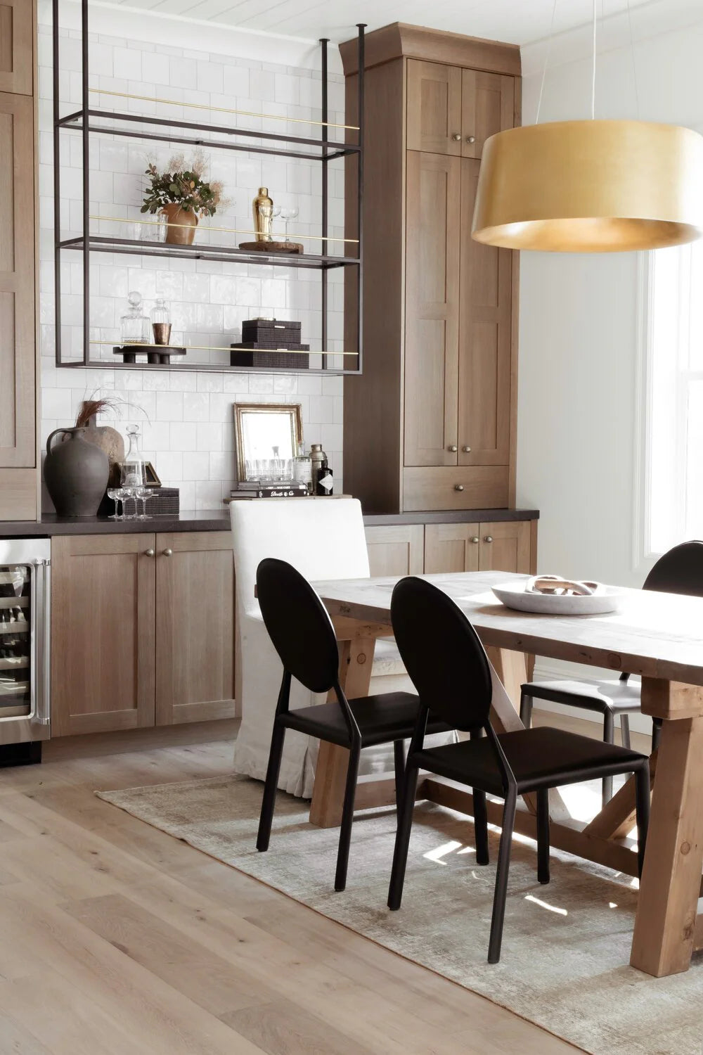 In this spec home, we designed a kitchen that feels modern yet timeless. The custom white oak stain blend is a standout feature, complemented by Swiss Coffee walls and marble countertops. A custom bar system and Rohl plumbing fixtures complete the refined look, creating a space that’s both functional and sophisticated.