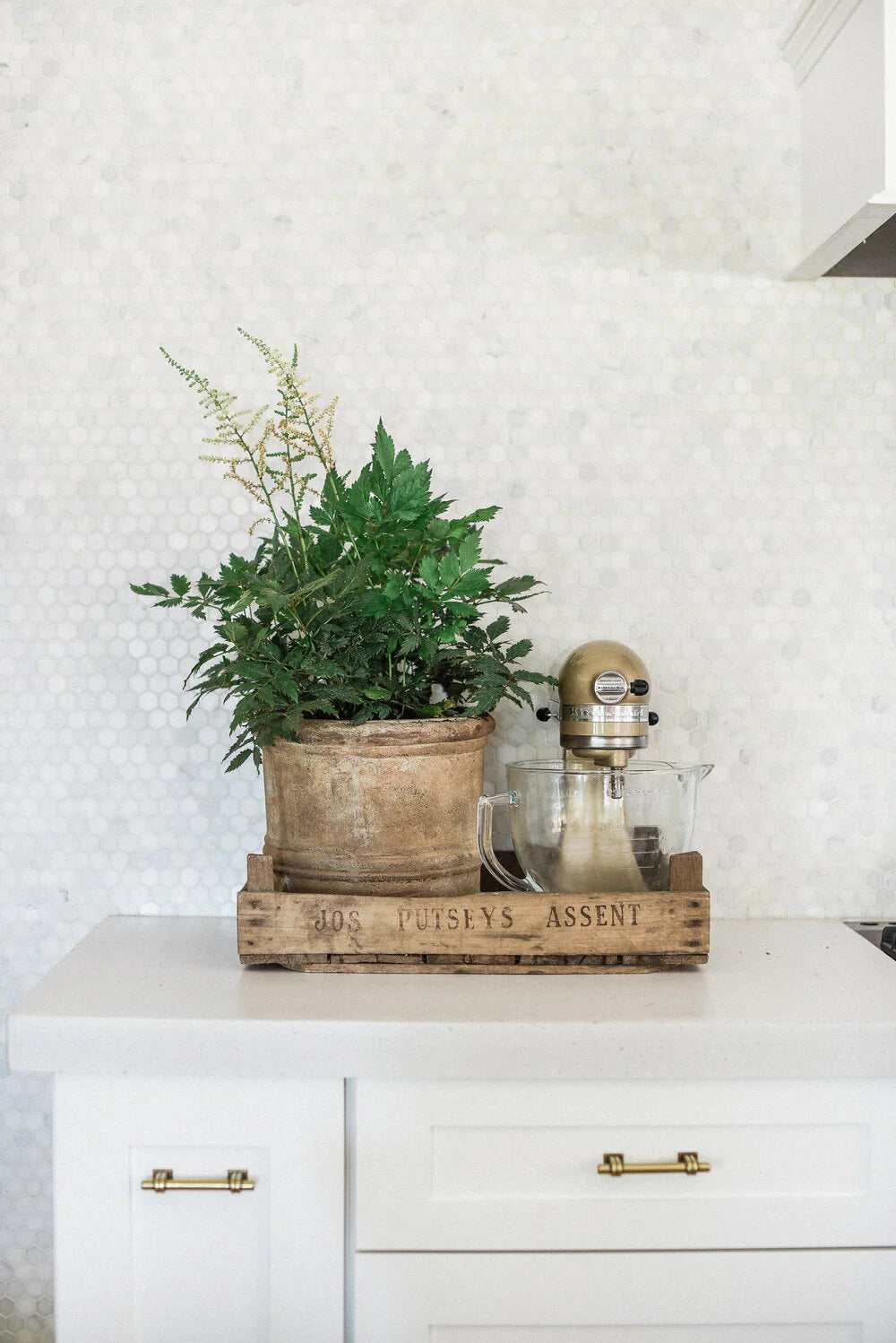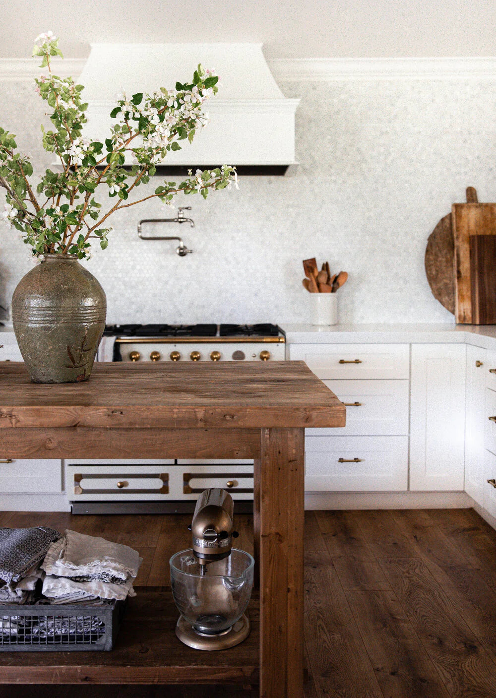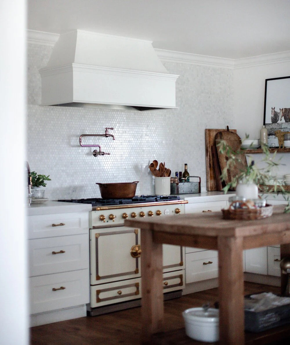 This ranch-style home renovation combines classic elements with modern touches. The kitchen features white shaker cabinets, a La Cornue French range, and a beautiful wood island. A farm sink, pot filler, and polished nickel faucet elevate the design, making it a space that’s both stylish and functional.